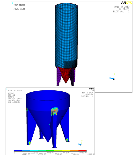 Beräkning silo för innehåll och extrema vindlaster. Olinjär FE-beräkning för att visa tillräcklig bärförmåga med avseende på skalbuckling.