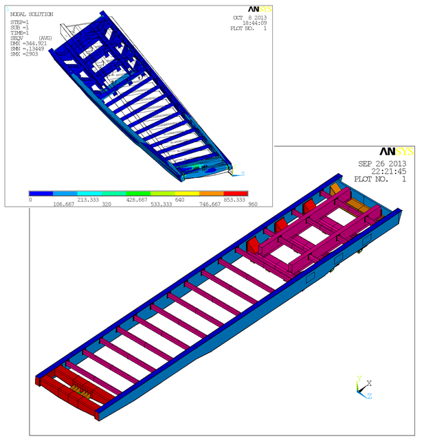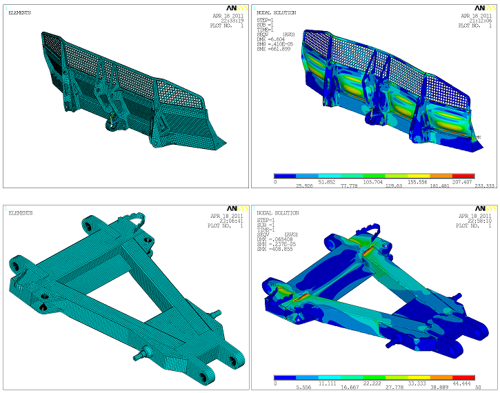 Statisk analys av en plog. Beräkningen utfördes baserat på kundens 3D modell i CAD som importerades och användes för skapandet av en FE-modell.