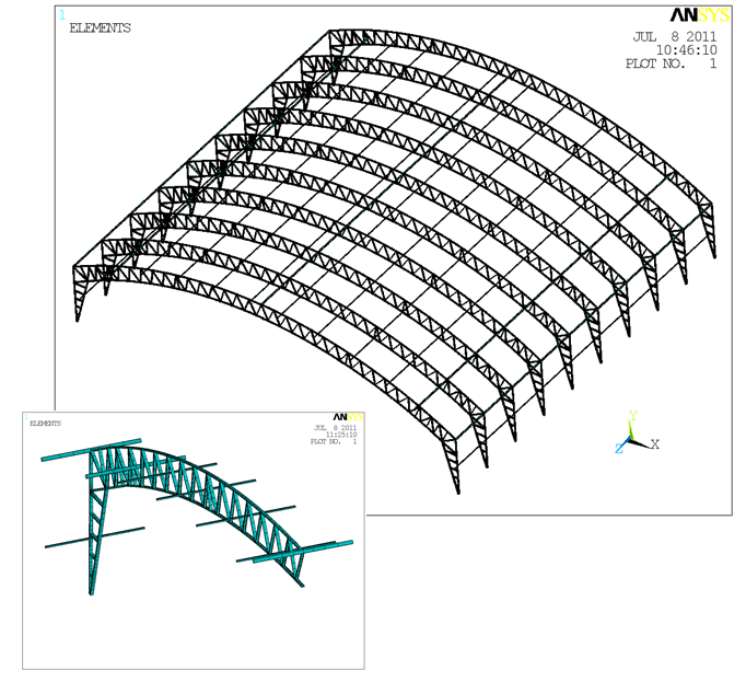 Beräkning av bärförmåga fackverksbåge i lagerhall. Innerhörnets stabilitet är för denna konstruktionstyp svårberäknad med andra metoder än FEM. I detta fall beräknades bärförmågan med olinjär stabilitetsanalys med ansatta initialimperfektioner affina med första kritisk mod. Tveksamheter kring konstruktionens bärförmåga hade förts fram men med olinjär FE-beräkning kunde normenlig bärförmåga påvisas. Med minsta möjliga marginal, dock.