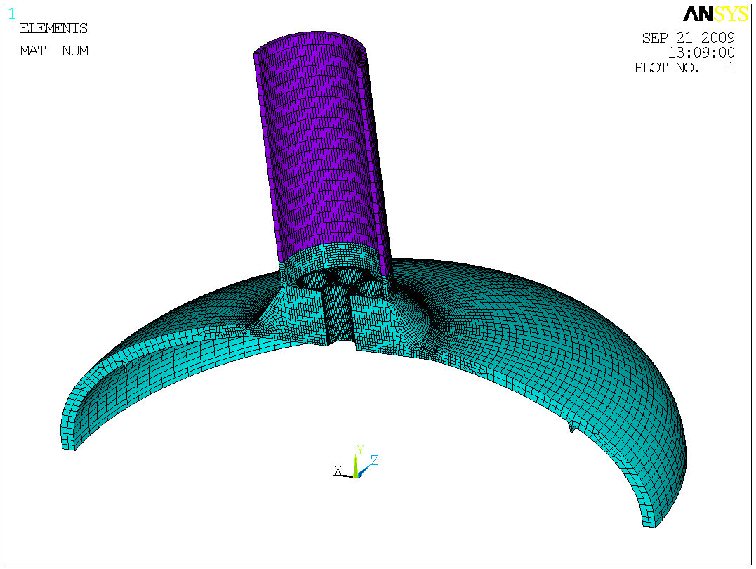 Beräkningsmodell (halv symmetrimodell) av ånggeneratortankens ovandel vilken utgörs av ångdom, ångstuts med urtag för venturi-insatser samt anslutande ångledning.