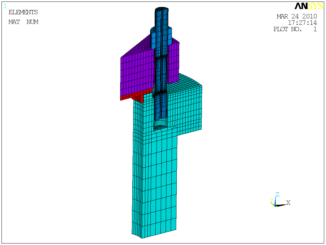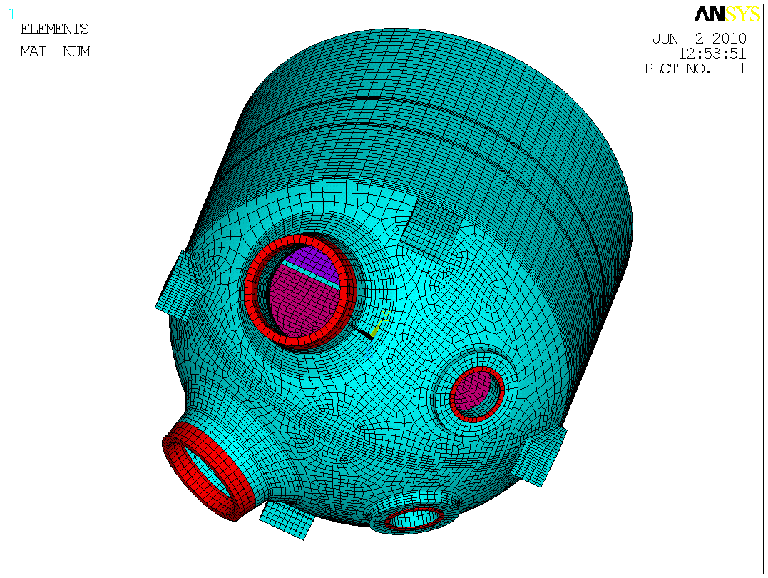 Beräkningsmodell av ånggeneratortankens nederdel. Olika färger representerar olika material. De stora öppningarna med innerdiameter på knappt 800 mm är inlopp och utlopp för ledningar från och till reaktortanken och de mindre är för manluckor. Manluckor med skruvförband analyseras i separat rapport. De fyra blockliknande delarna utgör upplag för vertikalstöd.