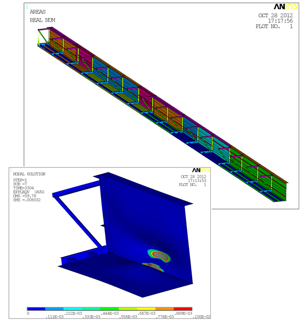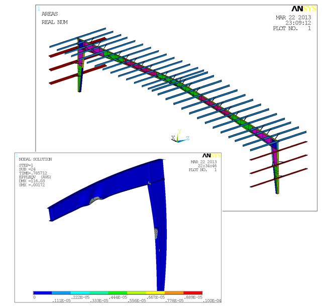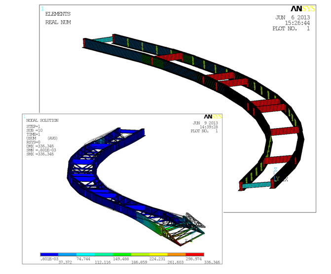 Beräkning samverkansbro (I-balkar i stål med samverkande betongfarbana) i kurva med sneda upplagspunkter över stöd för sidostabilitet under lansering samt kontroll av deformationer.